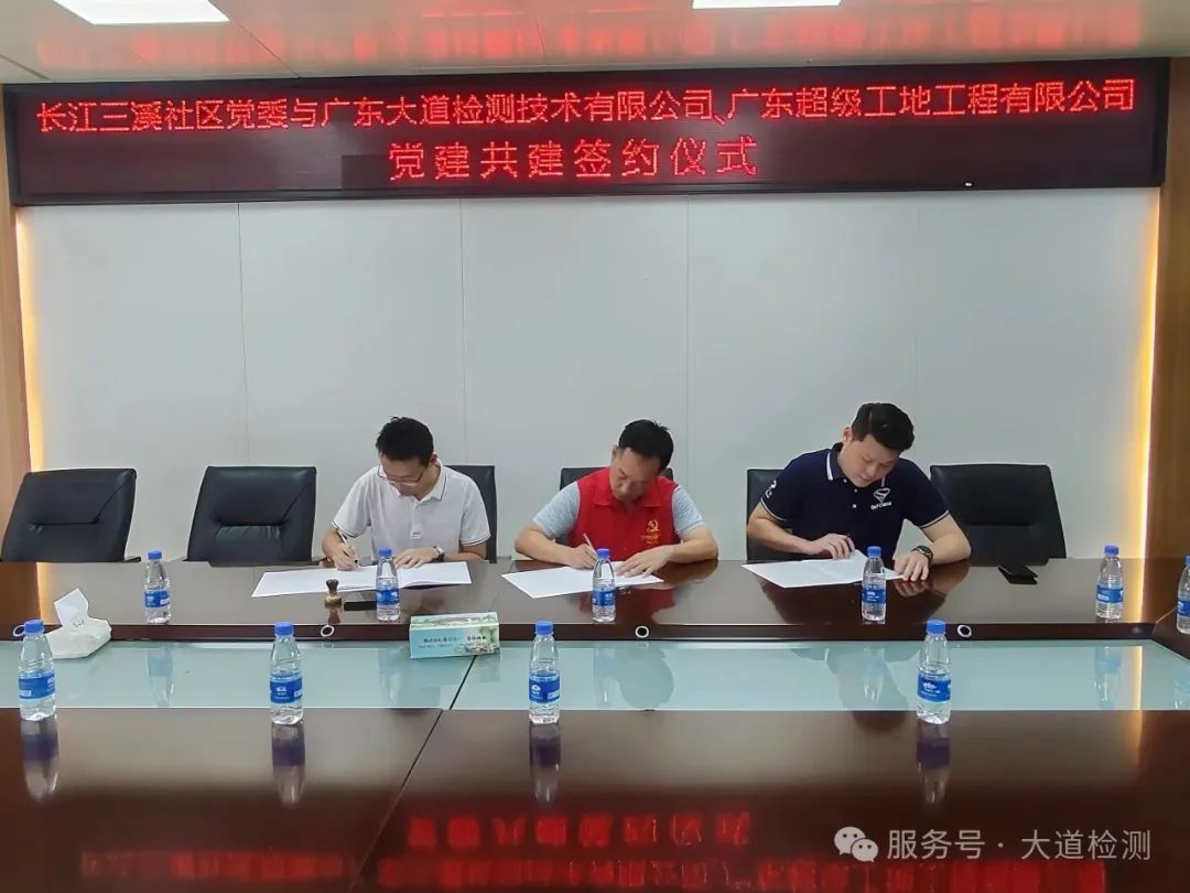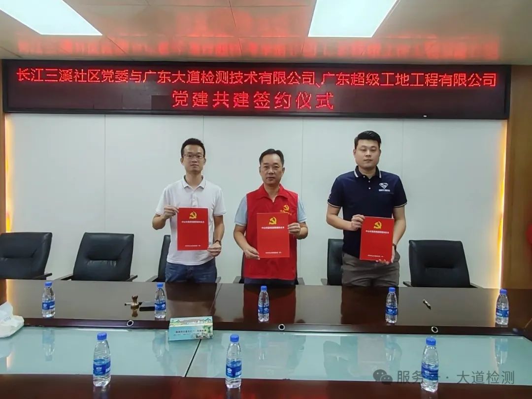 捐贈儀式后,三溪社區黨委書記唐宇麟與廣東大道檢測技術有限公司、廣東超級工地工程有限公司代表進行黨建共建簽約儀式,正式簽署《中山市基層黨建聯建協議書》,開啟黨建引領下合作的新篇章。