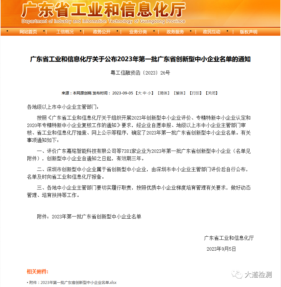 近日,廣東省工業和信息化廳公布了2023第一批廣東省創新型中小企業公示名單。廣東大道檢測技術有限公司憑借卓越的創新能力、現代化的經營理念,榮獲廣東省創新型中小企業的認定。這既是對我司技術實力、創新能力和業務運營方面不懈努力的肯定,同時也是我們公司未來發展前景的動力。